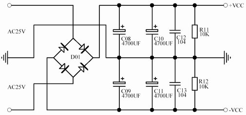 XDA02功放板的电源电路如下图所示,为了保证功放板的音质,电源变压器的输出功率不得低于80W,输出电压为2*25V,滤波电容采用2个4700UF/25V电解电容并联,正负电源共用4个4700UF/25V的电容,两个104的独石电容是高频滤波电容,有利于放大器的音质。