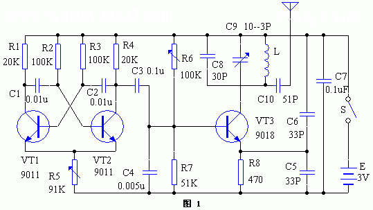 该装置是由发射机和接收机两部分组成的系统,工作于调频(FM)波段。发射机的电路工作原理见图1(点击下载原理图)。它是由三极管VT1、VT2及其外围元件构成的多谐振荡器,其工作频率约为1000Hz,其信号通过电容器C3取出去调制由VT3及其LC元件构成的调频振荡器,被调制的调频信号从C10输出,通过机内微型天线向空间辐射。其中C6的作用是加宽频带并能有效防止人体感应对频率的影响。