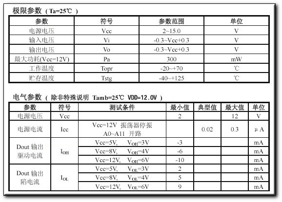 2262每次发射时至少发射4组字码,2272只有在连续两次检测到相同的地址码加数据码才会把数据码中的“1”驱动相应的数据输出端为高电平和驱动VT端同步为高电平。