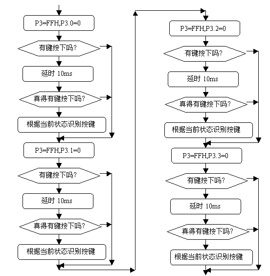 (2. 每个按键有它的行值和列值 ,行值和列值的组合就是识别这个按键的编码。矩阵的行线和列线分别通过两并行接口和CPU通信。每个按键的状态同样需变成数字量“0”和“1”,开关的一端(列线)通过电阻接VCC,而接地是通过程序输出数字“0”实现的。键盘处理程序的任务是:确定有无键按下,判断哪一个键按下,键的功能是什么;还要消除按键在闭合或断开时的抖动。两个并行口中,一个输出扫描码,使按键逐行动态接地,另一个并行口输入按键状态,由行扫描值和回馈信号共同形成键编码而识别按键,通过软件查表,查出该键的功能。