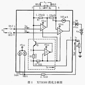 XTR101是一个精密、低漂移的双线变送器,它可以把微弱的电压信号进行放大并变换成4mA~20mA的电流信号后进行远距离传送。它由一个高精度的仪表放大器、压控输出电流源和2个精密的1mA电流源组成,图1是它的简化方框图。